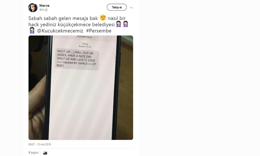 Küçükçekmece Belediyesi’nin SMS sistemi hack’lenmiş..Tüm Küçükçekmece Halkı’na, bu sabah küfürlü bir mesaj atılmış.. SMS sistemine bile sahip çıkamayan,halkına küfür ettiren bir Belediye,Küçükçekmece Halkı’na nasıl hizmet edecek.??????? pic.twitter.com/764Txl5Ve8