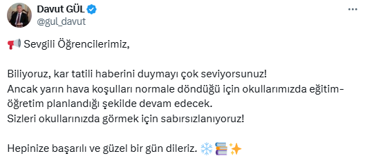"Sevgili Öğrencilerimiz, Biliyoruz, kar tatili haberini duymayı çok seviyorsunuz! Ancak yarın hava koşulları normale döndüğü için okullarımızda eğitim-öğretim planlandığı şekilde devam edecek. Sizleri okullarınızda görmek için sabırsızlanıyoruz! Hepinize başarılı ve güzel bir gün dileriz."