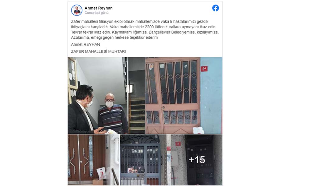 İstanbul'un Bahçelievler ilçesine bağlı Zafer Mahallesi'nin muhtarı Ahmet Reyhan, mahallede vaka sayısının 2200 olduğunu açıklayarak, 'lütfen kurallara uymayanı ikaz edin' diye çağrı yaptı.