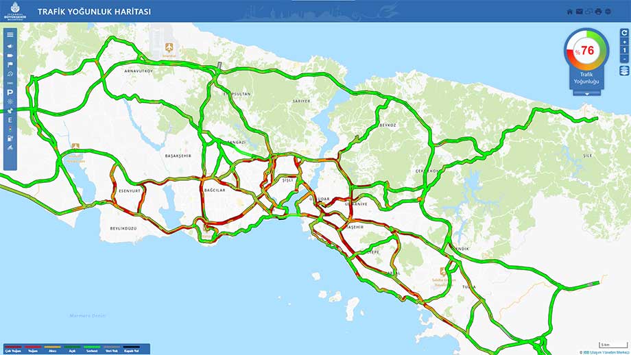 İstanbul Büyükşehir Belediyesi (İBB) Trafik Yoğunluk Haritası verilerine göre, kentte saat 08.30 itibarıyla trafik yoğunluğu yüzde 76'ya çıktı.