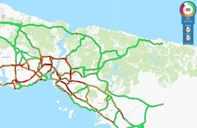 İstanbul'da etkisi sürdüren olumsuz hava koşulları hayatı olumsuz etkilemeye devam ediyor. Kentte öğleden sonra şiddetini arttıran sağanak yağış trafikte yoğunluğa neden oldu. İstanbul Büyükşehir Belediyesi'nin (İBB) haritasına göre kentte trafik yoğunluğu, saat 17.15 itibarıyla yüzde 90 olarak ölçüldü. 15 Temmuz Şehitler Köprüsü ile Anadolu Yakası'ndan Avrupa Yakası'na geçişte trafik yoğunluğu Ünalan'dan başlıyor. Diğer istikamette Çağlayan'dan başlayan trafik yoğunluğu, köprüde normale dönerken Ataşehir'de artıyor. https://tele1.com.tr/istanbul-bogazi-gemi-trafigine-acildi-961699/