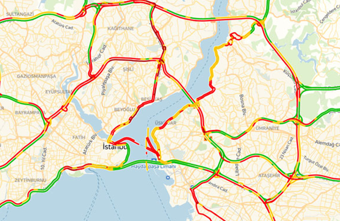 İstanbul'da akşam saatlerinden itibaren hızını arttıran yağmurlu birlikte trafik yoğunluğu da arttı. Yoğunluk özellikle ana arterlerde etkisini gösterirken, İstanbul Büyükşehir Belediyesi trafik yoğunluk haritasına göre, 18.00 itibarıyla yoğunluk yüzde 80'e ulaştı.