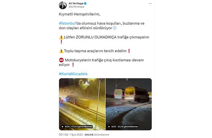 İstanbul’da geçtiğimiz hafta sonundan beri devam eden etkili kar yağışı gündelik yaşamda aksaklıklara neden oluyor. İstanbul Valisi Ali Yerlikaya da kar yağışının olası olumsuzluklarına karşı zorunlu olmadıkça trafiğe çıkılmaması uyarısında bulundu.. Ali Yerlikaya’nın yaptığı sosyal medya paylaşımı şu şekilde: “Kıymetli Hemşehrilerim, #İstanbul’da olumsuz hava koşulları, buzlanma ve don olayları etkisini sürdürüyor. Lütfen ZORUNLU OLMADIKÇA trafiğe çıkmayalım. Toplu taşıma araçlarını tercih edelim. Motokuryelerin trafiğe çıkış kısıtlaması devam ediyor #KarlaMücadele”