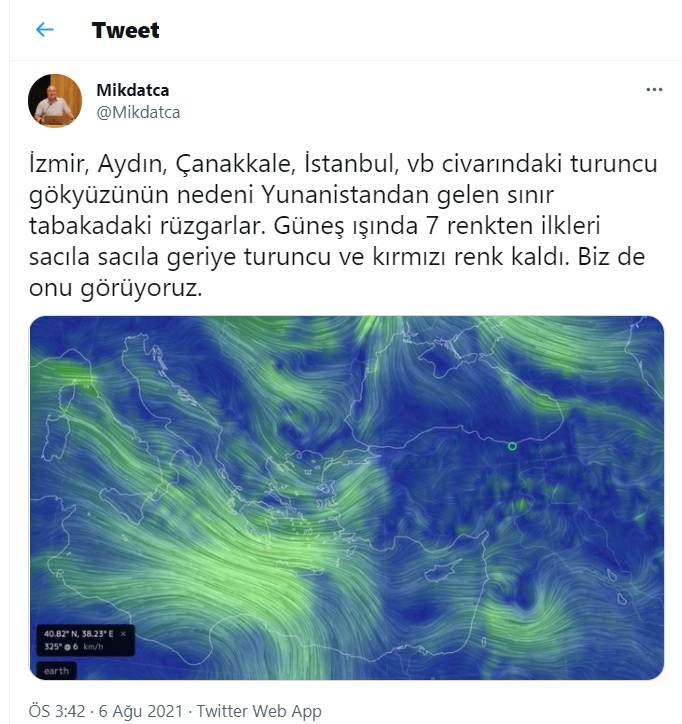 "İzmir, Aydın, Çanakkale ve İstanbul'da oluşan turuncu gökyüzünün nedeni Yunanistan'dan gelen sınır tabakadaki rüzgarlar. Güneş ışında 7 renkten ilkleri saçıla saçıla geriye turuncu ve kırmızı renk kaldı. Biz de onu görüyoruz. Solunum yolu hastalıklarına hassas olanlar bu havalarda dışarı çıkmaması lazım ve ulusal kalite izleme ağından kirletici miktarlarını takip etmesi gerekir."