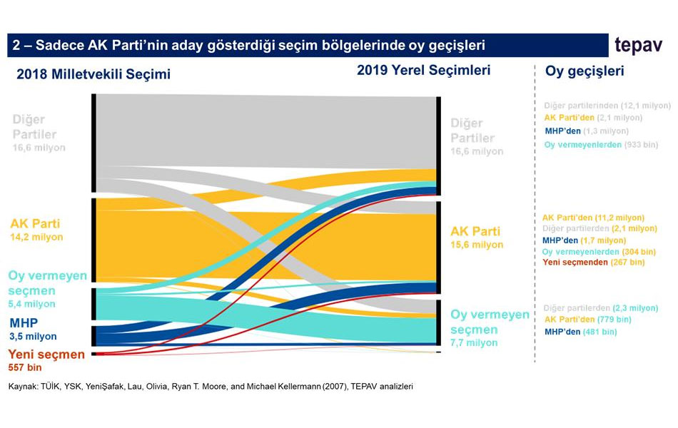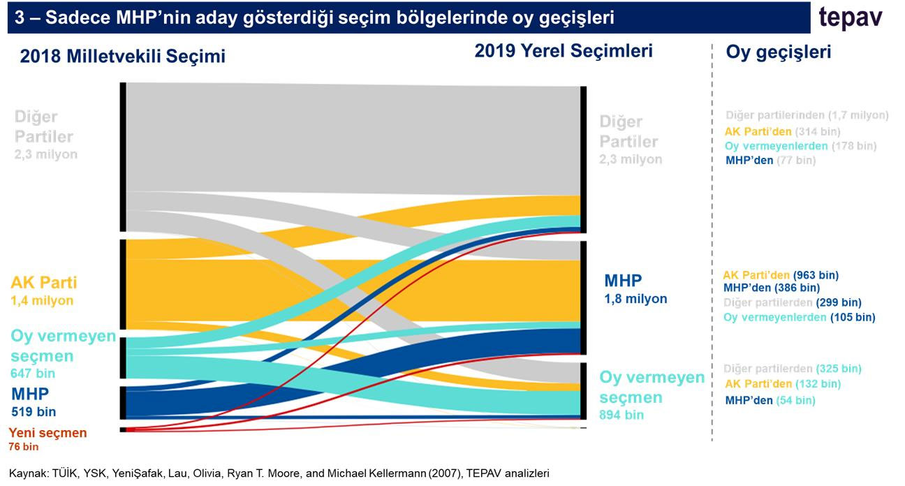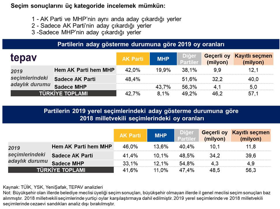 Türkiye Ekonomi Politikaları Araştırma Vakfı'ın (TEPAV) çıkarım tablolarına göre, 2019'da AKP'nin aday çıkardığı, MHP'nin aday çıkarmadığı yerlerde, 3. 5 milyon MHP'linin AKP'ye oy atması beklenirken sadece 1,7 milyon MHP'li AKP'ye oy atmış.