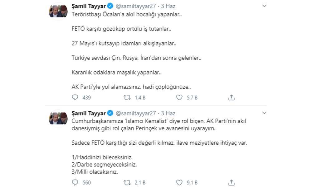 "Şamil Tayyar'ın görevi bırakmasına neden olan ve rahatsızlık getiren, 'Cumhurbaşkanımıza ‘İslamcı Kemalist’ diye rol biçen, AK Parti’nin akıl danesiymiş gibi rol çalan Perinçek ve avanesini uyarayım. Sadece FETÖ karşıtlığı sizi değerli kılmaz, ilave meziyetlere ihtiyaç var.
