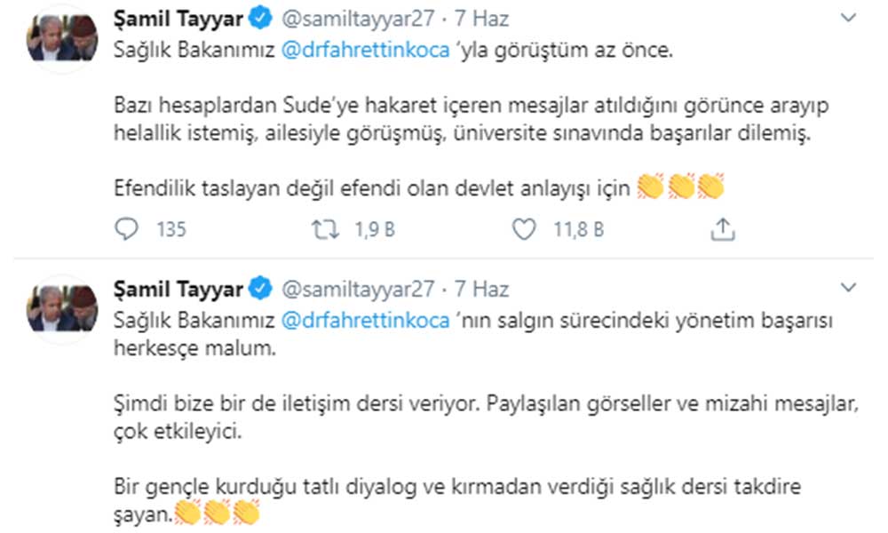 'Sağlık Bakanımız @drfahrettinkoca‘yla görüştüm az önce. Bazı hesaplardan Sude’ye hakaret içeren mesajlar atıldığını görünce arayıp helallik istemiş, ailesiyle görüşmüş, üniversite sınavında başarılar dilemiş. Efendilik taslayan değil efendi olan devlet anlayışı için'Bu tweetin kırılma noktası olduğunu düşünüyorum."