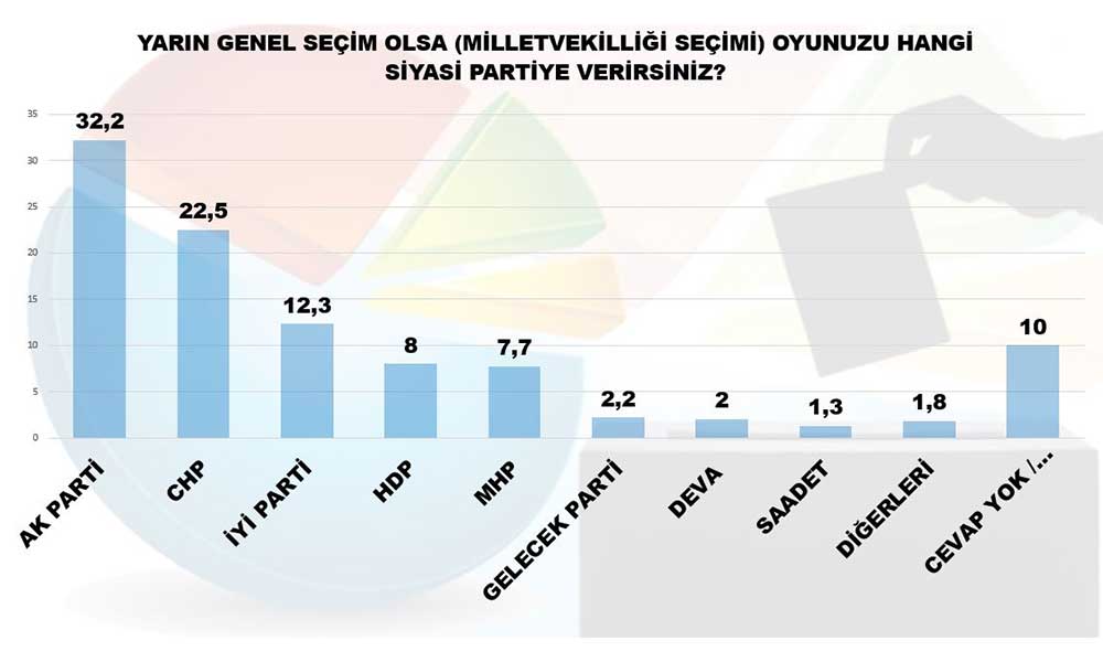 MAK’ın 14-26 Ocak tarihleri arasında gerçekleştirdiği anketin sonuçlarına göre, “Yarım genel seçim olsa” başlığı altında vatandaşlara hangi partiye oy verecekleri soruldu. Vatandaşın yüzde 32,2’si tercihini AKP’den yana kullandı. CHP yüzde 22,5, İYİ Parti yüzde 12,3 oy alırken, baraj altında kalan HDP yüzde 8, MHP ise yüzde 7,7 oy aldı. Ankette Gelecek Partisi’nin yüzde 2,2 DEVA Partisi’nin ise yüzde 2 oy aldığı görüldü. Kararsızlar ise seçim barajını aşarak yüzde 10 çıktı.