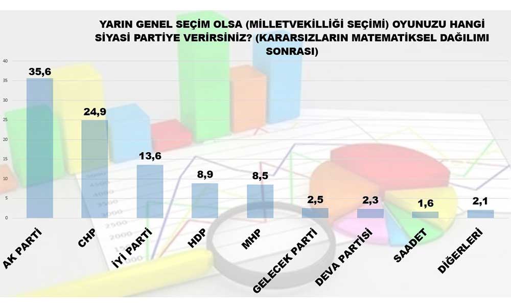 Kararsızların oylarının dağıtılmasıyla Recep Tayyip Erdoğan liderliğindeki AKP yüzde 35,6, Kemal Kılıçdaroğlu’nun partisi CHP yüzde 24,9, Meral Akşener’in Genel Başkanlığını yürüttüğü İYİ Parti yüzde 13,6 oy oranına yükseldi. HDP’nin yüzde 8,9, Devlet Bahçeli’nin partisi MHP ise yüzde 8,5 oy oranına ulaşarak yine seçim barajı altında kaldı.