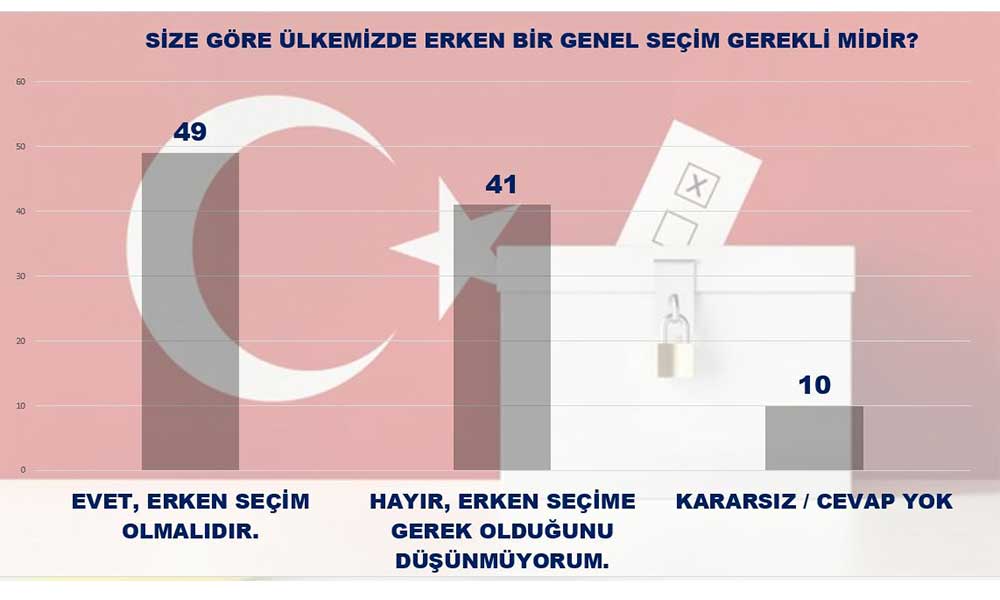 Ankette erken seçim sorusu da vatandaşa soruldu.Seçmenin yüzde 49’u erken seçim yapılması görüşünü bildirirken, erken seçime gerek olmadığını belirten vatandaşların oranı ise yüzde 41 olarak belirtildi. Seçmenin yüzde 10’u ise bu soruya yanıt vermekte kararsız kaldı.