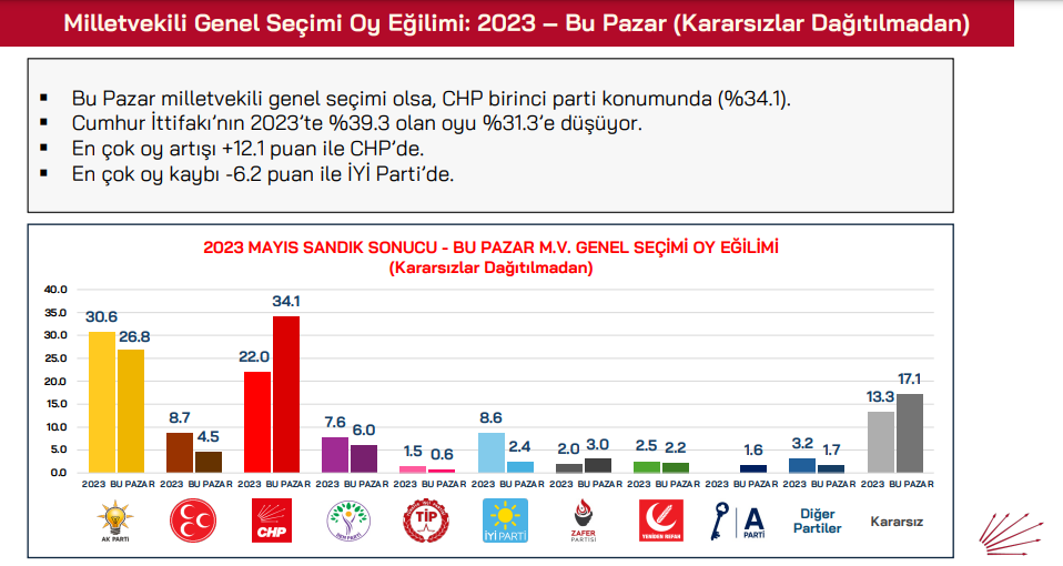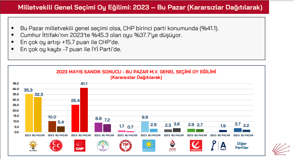 Bu pazar seçim olsa CHP 2023'e seçimlerine göre oy oranını en çok arttıran parti konumunda yer alıyor. Kararsızlar dağıtılmadan önce bu pazar yapılacak bir seçimde CHP'nin oy oranı 2023'de aldığı yüzde 22'den yüzde 34'e yükseliyor. AKP'nin ise 2023'te aldığı yüzde 30.6'lık oy oranı yüzde 26.8'e geriliyor. MHP yüzde 8.7'den yüzde 4.55'e DEM Parti ise yüzde 7.6'dan yüzde 6.0'a geriliyor.