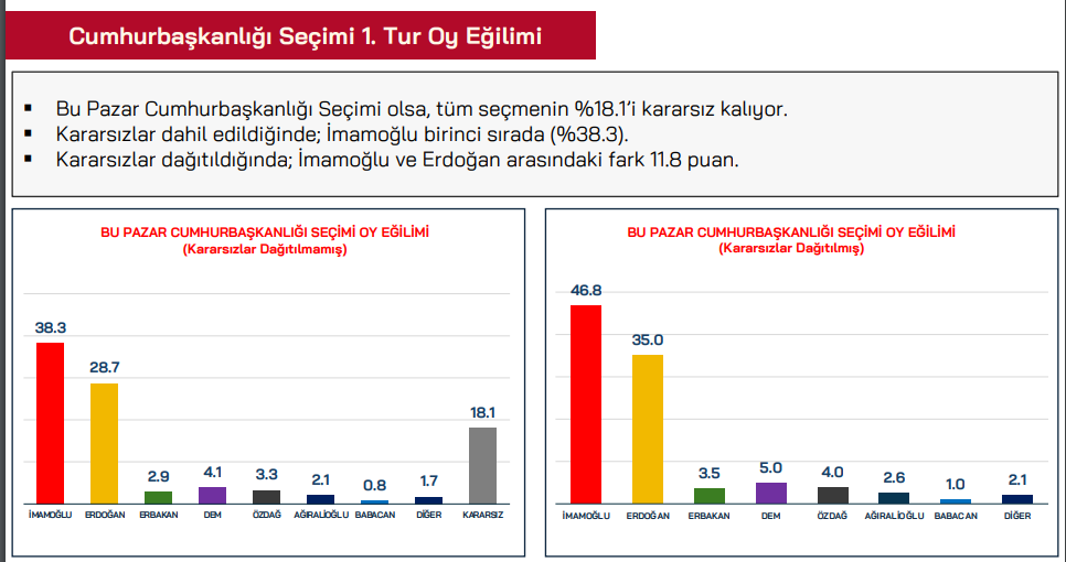 Cumhurbaşkanlığı seçiminde ise kararsızlar dağıtılmadan tutuklu Cumhurbaşkanı adayı Ekrem İmamoğlu yüzde 38.3, Erdoğan ise yüzde 28.7'lik oy oranına sahip. Kararsızlar dağıtıldıktan sonra ise İmamoğlu'nun oy oranı yüzde 46.8, Erdoğan'ın oy oranı ise yüzde 35 oluyor.