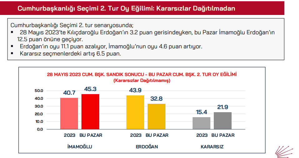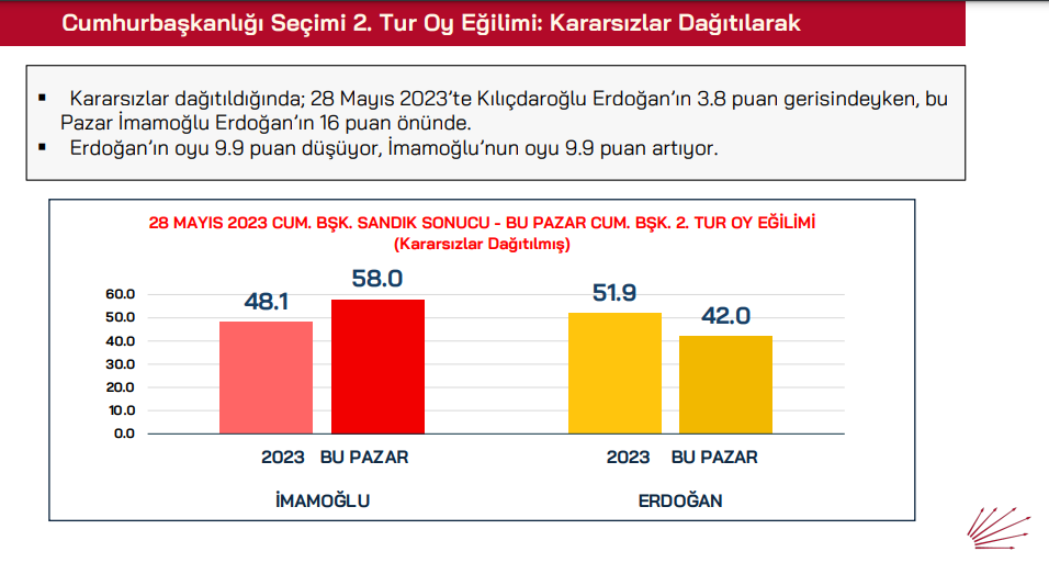 Kararsızlar dağıtılmadan sonra ise 28 Mayıs 2023’te Kılıçdaroğlu Erdoğan’ın 3.8 puan gerisindeyken, bu pazar İmamoğlu Erdoğan’ın 16 puan önünde yer alıyor.