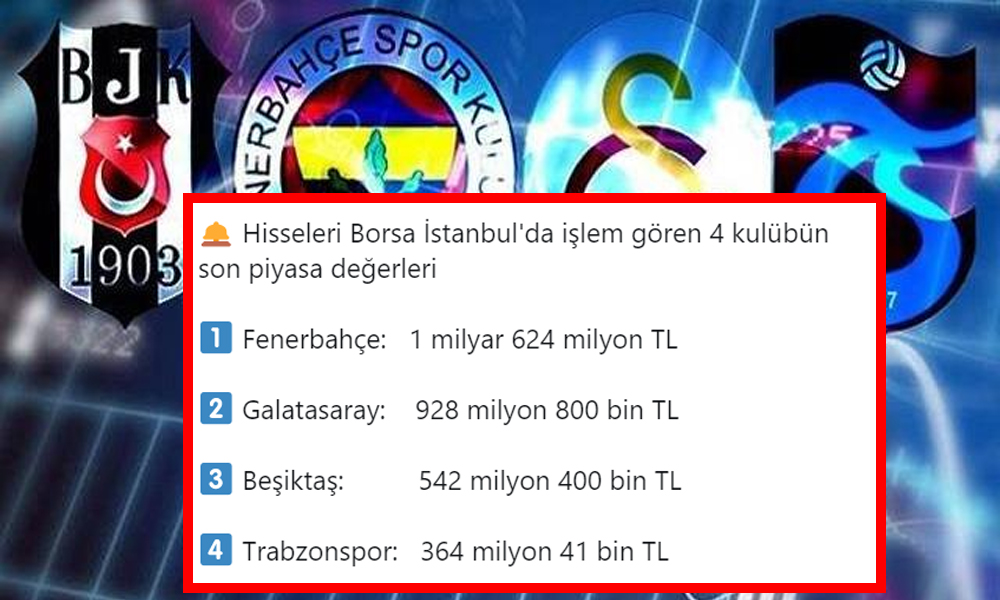 Türkiye’nin en büyük futbol kulüpleri ligdeki rekabetlerinin yanı sıra, Borsa İstanbul’da piyasa değeri açısından kıyasıya bir yarış halinde. Spor ekonomisti ve yazar Ceyhun Kuburcu, konuya ilişkin olarak "Hisseleri Borsa İstanbul'da işlem gören 4 kulübün son piyasa değerleri" ifadeleri BİST 100 sıralama listesini yayınladı. O listeye göre; Fenerbahçe: 1 milyar 624 milyon TL Galatasaray: 928 milyon 800 bin TL Beşiktaş: 542 milyon 400 bin TL Trabzonspor: 364 milyon 041 bin TLPeki bu sezon başlangıcında Türk kulüpleri ne kadar harcama yapmıştı?