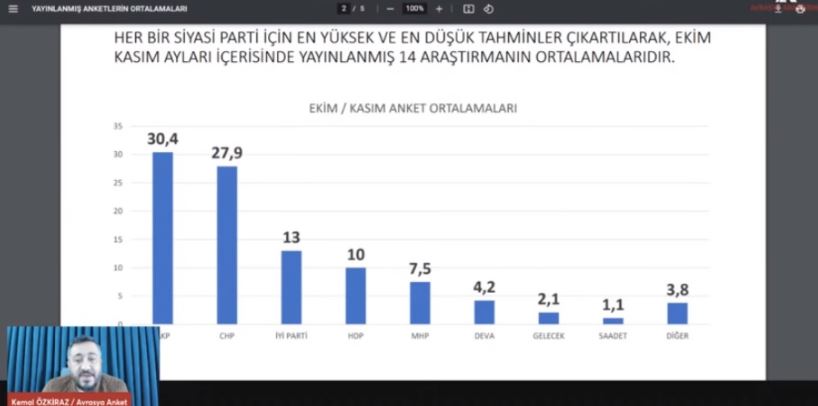 Avrasya Araştırma'nın sahibi Kemal Özkiraz, Ekim ve Kasım aylarında yapılan 14 anketin ortalama oy oranlarını açıkladı.
