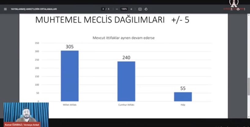 Özkiraz'ın Ekim ve Kasım ayında yayımlanmış 14 anketin ortalamasından derlediği verilere göre, Millet İttifakı Meclis'te 300 vekili geçebiliyor. Cumhur İttifakı'nda ise durum hiç iç açıcı değil. Özkiraz, Cumhur İttifakı'nın 200 vekile kadar gerileyebileceğini ifade etti.
