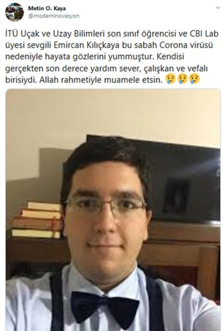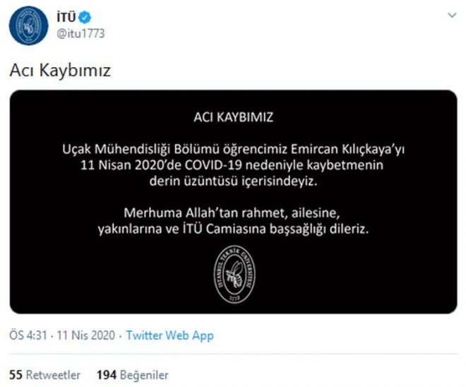 Üniversiteden yapılan açıklamada, "Uçak Mühendisliği Bölümü öğrencimiz Emircan Kılıçkaya'yı 11 Nisan 2020'de COVID-19 nedeniyle kaybetmenin derin üzüntüsü içerisindeyiz. Merhuma Allah'tan rahmet, ailesine, yakınlarına ve İTÜ Camiasına başsağlığı dileriz" denildi.