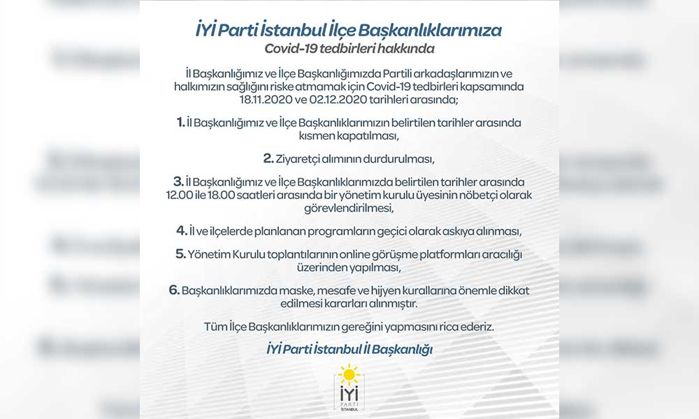 Yeni tip koronavirüs salgınının ülke genelinde yükselişe geçmesinin ardından İYİ Parti'den adım geldi. İYİ Parti İstanbul İl Başkanlığı, yarından itibaren geçerli olmak üzere aldıkları önlemleri açıkladı. İyi Parti İstanbul İl Başkanlığı'ndan yazılı olarak duyurulan önlemlerde il ve ilçe başkanlıkları 18.11.2020 ile 02.12.2020 tarihleri arasında kısmen kapatılırken, 'ziyaretçi alımının durdurulduğu' belirtildi. İl Başkanlığı tarafından alınan tedbirler şöyle: