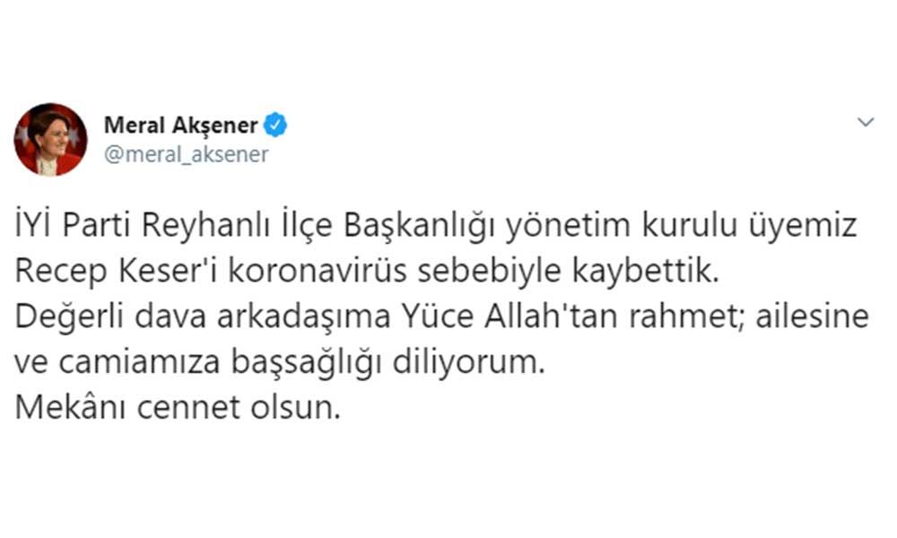 İYİ Parti Genel Başkanı Meral Akşener, İYİ Parti Reyhanlı İlçe Başkanlığı yönetim kurulu üyesi Recep Keser, koronavirüs nedeniyle hayatını kaybettiğini duyurdu.