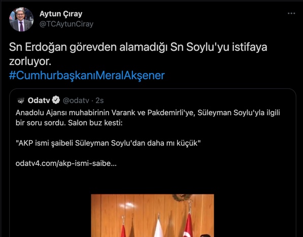 İYİ Partili Aytun Çıray, Anadolu Ajansı muhabiri Musab Turan'ın Sanayi ve Teknoloji Bakanı Mustafa Varank ile Tarım ve Orman Bakanı Bekir Pakdemirli'ye İçişleri Bakanı Süleyman Soylu ile ilgili olarak soru sormasının ardından çarpıcı bir yorum yaptı.