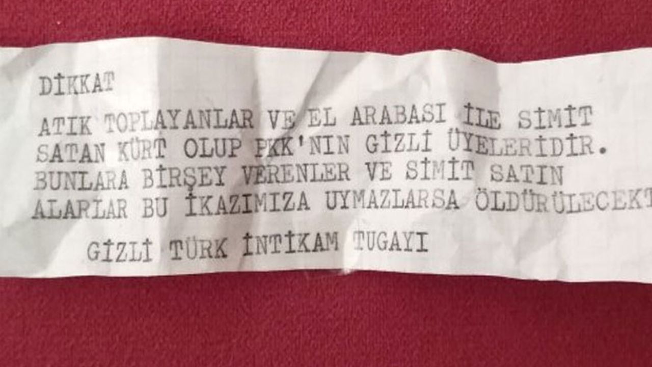 Söz konusu mesajda, “Dikkat, atık toplayanlar ve el arabası ile simit satan Kürt olup PKK’nın gizli üyeleridir. Bunlara bir şey verenler ve simit satın alanlar bu ikazımıza uymazlarsa öldürülecektir” ifadeleri yer aldı. Mesajda ayrıca ‘Gizli Türk İntikam Tugayı’ imzası kullanıldı.