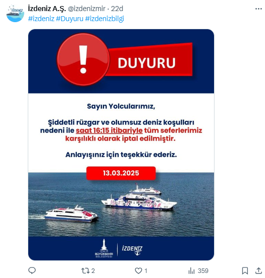 İZDENİZ'den yapılan açıklamaya göre, saat 16:15 itibariyle tüm seferler şiddetli rüzgar nedeniyle karşılıklı iptal edildi.