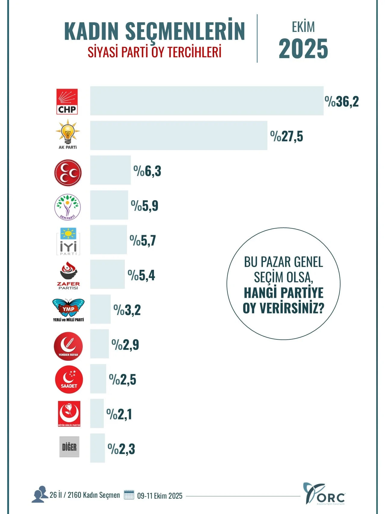 ORC Araştırma 26 ilde 2 bin 160 kadın seçmenle 9-11 Ekim tarihleri arasında gerçekleştirdiği anket sonuçlarını yayımladı. Ankette seçmenlere siyasi parti isimleri okunarak, "Bu Pazar Genel Seçim Olsa, Hangi Partiye Oy Verirsiniz?" sorusu yöneltildi.