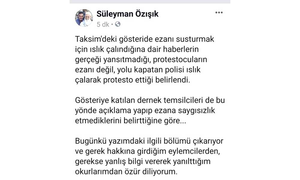 Konu hakkında yanlış bilgi aldığını söyleyen Süleyman Özışık, okuyucularından özür dilemişti.