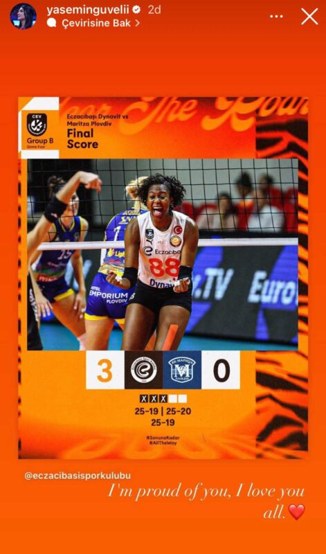 Yasemin Güveli bu akşam CEV Şampiyonlar Ligi'nde Bulgaristanlı ekip Maritza Plovdiv'i 3-0 mağlup eden Eczacıbaşı Dynavit hakkında bir paylaşım yaptı. Kulübün resmi Instagram hesabında yaptığı maç sonucu paylaşımını hikayesine ekleyen orta oyuncu "Sizinle gurur duyuyorum, hepinizi seviyorum." sözleriyle takımına destek verdi. FERHAT AKBAŞ'TAN AÇIKLAMA Mücadele sonrasında başantrenör Ferhat Akbaş konuyla ilgili Voleybolun Sesi'ne yaptığı açıklamada şu ifadeleri kullandı: "Mental ve fiziksel olarak şu an çok hazır değil. Ona biraz zaman tanımımız gerekiyor. Onunla karşılıklı konuşarak bu kararı aldık. Ben onun çok iyi bir şekilde hazırlanacağını ve tekrar aramıza döneceğine eminim."