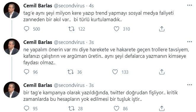 Cemil Barlas devamında, “Ne yapalım önerin var mı diye harekete ve hakarete geçen trollere tavsiyem, kafanızı çalıştırın ve argüman üretin... Aynı şeyi defalarca yazmanın kimseye faydası olmaz. Bir tag’e kampanya olarak yazıldığında, Twitter doğrudan fişliyor... Kritik zamanlarda bu hesapların yok edilmesi bir tuşluk iştir” ifadelerini kullandı.