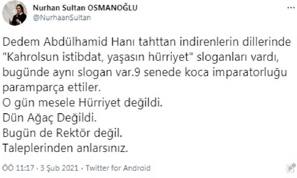 Osmanlı hükümdarı 2. Abdülhamid’in tahttan indirilişiyle özdeşleşen "Kahrolsun istibdat, yaşasın hürriyet!" sloganı, Boğaziçi Üniversitesi'nde devam eden eylemlerle birlikte yeniden dillere yerleşti. AKP'li Cumhurbaşkanı Erdoğan'ın üniversiteye rektör atadığı Melih Bulu'ya karşı özellikle sosyal medyada dile getirilen slogan, 2. Abdülhamit’in dördüncü kuşaktan torunu Nurhan Sultan Osmanoğlu'nu rahatsız etti. Osmanoğlu, rahatsızlığını Twitter hesabından "Dedem Abdülhamid Hanı tahttan indirenlerin dillerinde "Kahrolsun istibdat, yaşasın hürriyet" sloganları vardı, bugünde aynı slogan var.9 senede koca imparatorluğu paramparça ettiler. O gün mesele hürriyet değildi. Dün ağaç değildi. Bugün de rektör değil. Taleplerinden anlarsınız" diyerek ifade etti. İşte Nurhan Sultan Osmanoğlu'nun paylaşımı: