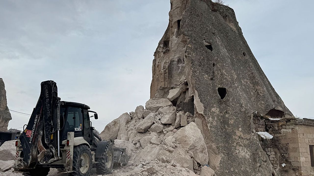 Uçhisar Belediyesi ekipleri, kopan kaya parçalarını iş makinesi yardımıyla kaldırarak alanda temizlik çalışması yaptı.