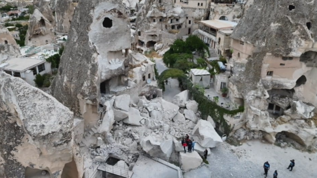 Öte yandan yıkılan peribacasının karşısında bulunan iş yerine yansıyan güvenlik kamerası görüntülerinde, peribacasının yıkılmasıyla birlikte çevreyi toz bulutunun kapladığı görüldü.