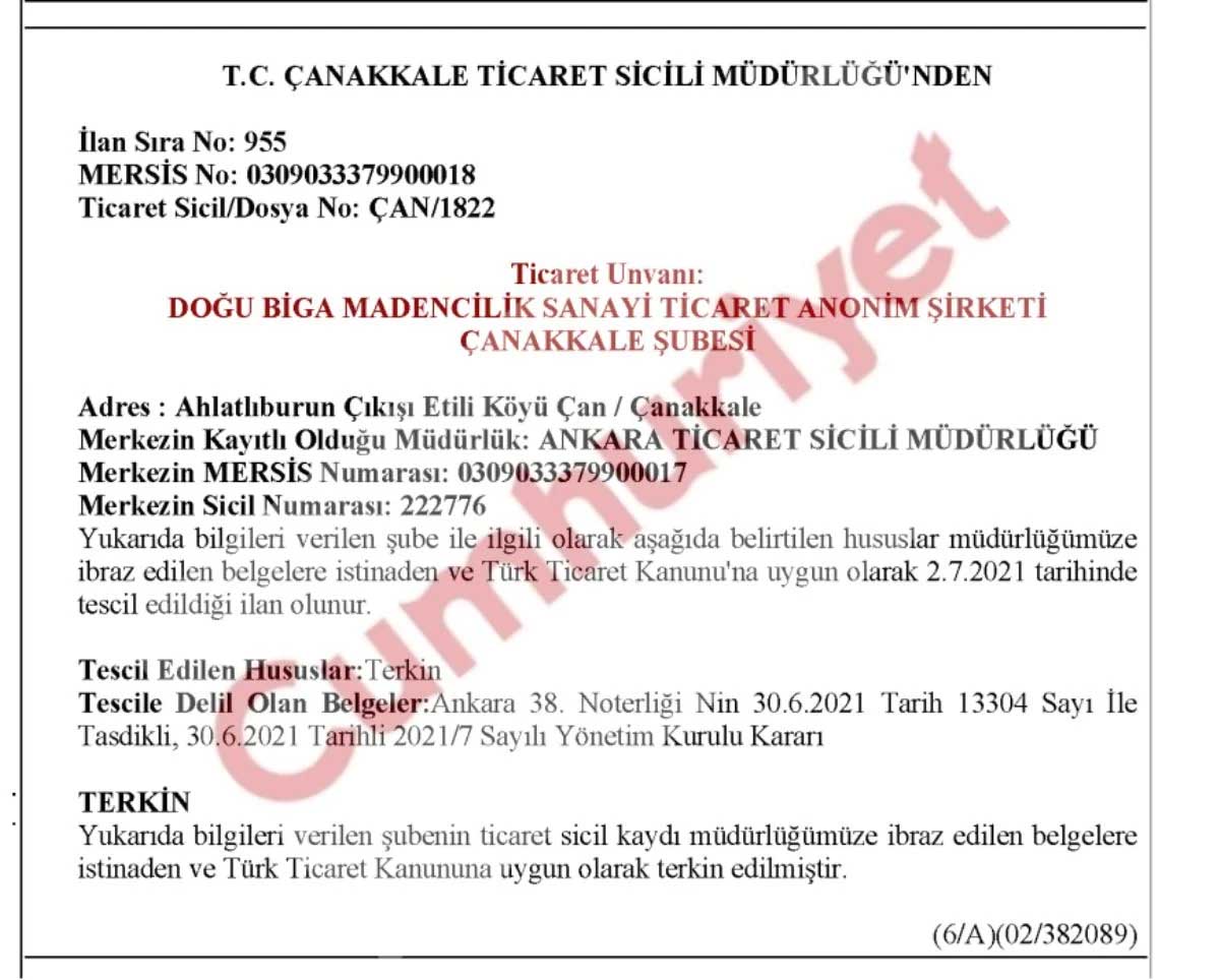 Kaz Dağları'nda talanıyla gündeme gelen Doğu Biga Madencilik şirketin genel müdürü 'Kaz Dağları'ndan gitmiyoruz' açıklamasını yapmasının ardından görevden alınmıştı. Şirketin Çanakkale şubesini de sessiz sedasız kapattığı ortaya çıktı.