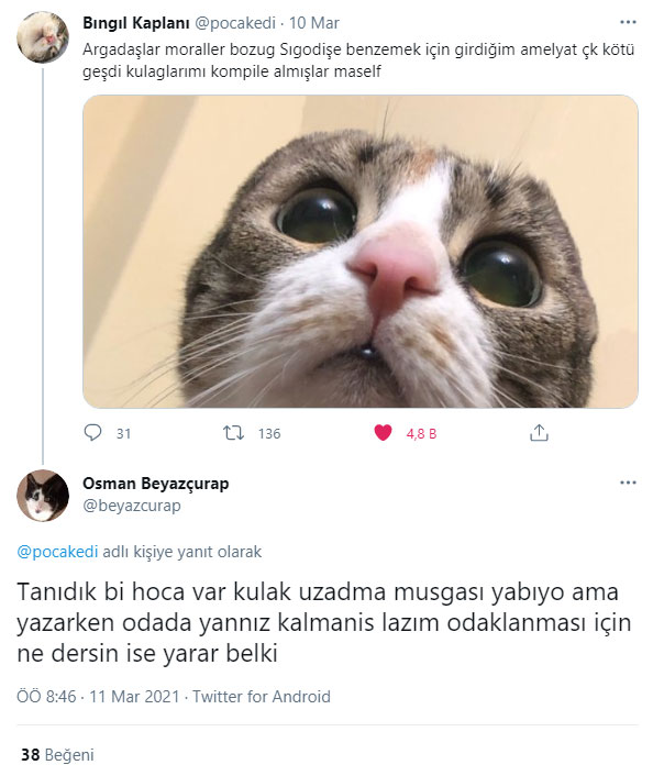 Sosyal paylaşım sitesi Twitter üzerinden evcil hayvanlar adına açılan hesaplar, kullanılan esprili ifadeler ile yoğun ilgi görüyor. Özellikle kedilerin 'konuşturulduğu' hesaplar, hayvanseverler tarafından ilgiyle takip ediliyor. 'Bıngıl Kaplanı' isimli hesaptan yapılan bir paylaşımın altında yer alan yorumlar ise oldukça dikkat çekici. Dış görünüşleri nedeniyle insanların sahiplenmeyi daha çok tercih ettiği Scottish Fold cinsi kedilere benzemek için sözde ameliyat olan Bıngıl Kaplanı, ameliyat sırasında yanlışlıkla kulaklarının kesildiğine yönelik paylaşım yaptı. Bunun üzerine sözde bir başka kediye ait hesaptan "Tanıdık bir hoca var kulak uzatma muskası yapıyor ama yazarken odada yalnız kalmanız lazım odaklanması için. Ne dersin işe yarar belki?" şeklinde yorum yapıldı. Daha önce gündeme gelen, kendisini hoca olarak tanıtıp bir kadını soyarak bedenine Arapça yazılar yazan 'cinci hoca'ya gönderme yapan tweet diğer kedi hesapları tarafından da beğenildi.