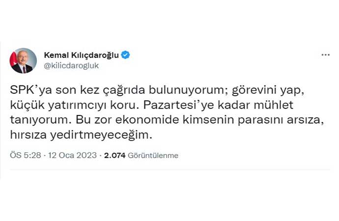 Kemal Kılıçdaroğlu, "SPK’ya son kez çağrıda bulunuyorum; görevini yap, küçük yatırımcıyı koru. Pazartesi’ye kadar mühlet tanıyorum. Bu zor ekonomide kimsenin parasını arsıza, hırsıza yedirtmeyeceğim" ifadelerini kullandı.