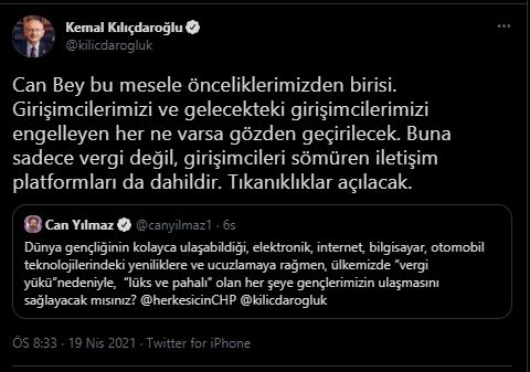 CHP Genel Başkanı Kemal Kılıçdaroğlu, Twitter hesabı üzerinden kendisine sorulan bir soruya yanıt verdi. Kafa Dergisi'nden Can Yılmaz'ın tweetini alıntılayan Kılıçdaroğlu'nun cevabı, kısa sürede sosyal medyanın gündemine oturdu. Can Yılmaz'ın "Dünya gençliğinin kolayca ulaşabildiği, elektronik, internet, bilgisayar, otomobil teknolojilerindeki yeniliklere ve ucuzlamaya rağmen, ülkemizde “vergi yükü”nedeniyle, “lüks ve pahalı” olan her şeye gençlerimizin ulaşmasını sağlayacak mısınız? @herkesicinCHP @kilicdarogluk" sorusunu alıntılayarak yanıtlayan Kılıçdaroğlu şunları söyledi: "Can Bey bu mesele önceliklerimizden birisi. Girişimcilerimizi ve gelecekteki girişimcilerimizi engelleyen her ne varsa gözden geçirilecek. Buna sadece vergi değil, girişimcileri sömüren iletişim platformları da dahildir. Tıkanıklıklar açılacak."