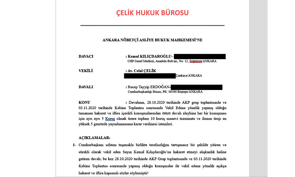 "Cumhurbaşkanı sıfatını taşımakla birlikte tarafsızlığını tartışmasız bir şekilde yitiren ve sürekli olarak vekil eden Sayın Kemal Kılıçdaroğlu’na hakaret etmeyi alışkanlık haline getiren davalı; bu kez 28.10.2020 tarihinde AKP Grup toplantısında ve 03.11.2020 tarihinde Kabine Toplantısı sonrasında yapmış olduğu konuşmalar ile vekil edene yönelik açıkça hakaret ve iftira kapsamlı sözler söylemiştir!HAKARET VE İFTİRA KAPSAMLI SÖZLER SARF ETTİ