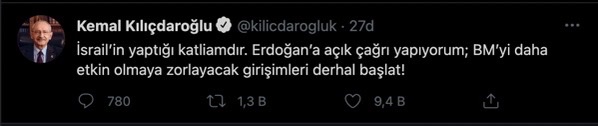 Kılıçdaroğlu, "İsrail'in yaptığı katliamdır" dedi ve Erdoğan'a çağrıda bulunarak, İsrail'in Filistinlilere yönelik saldırılarından dolayı Birleşmiş Milletler'i etkin olmaya zorlayacak girişimlerin başlatılması önerisinde bulundu. https://tele1.com.tr/israil-gazze-seridini-bombaladi-3u-cocuk-9-can-kaybi-388547/