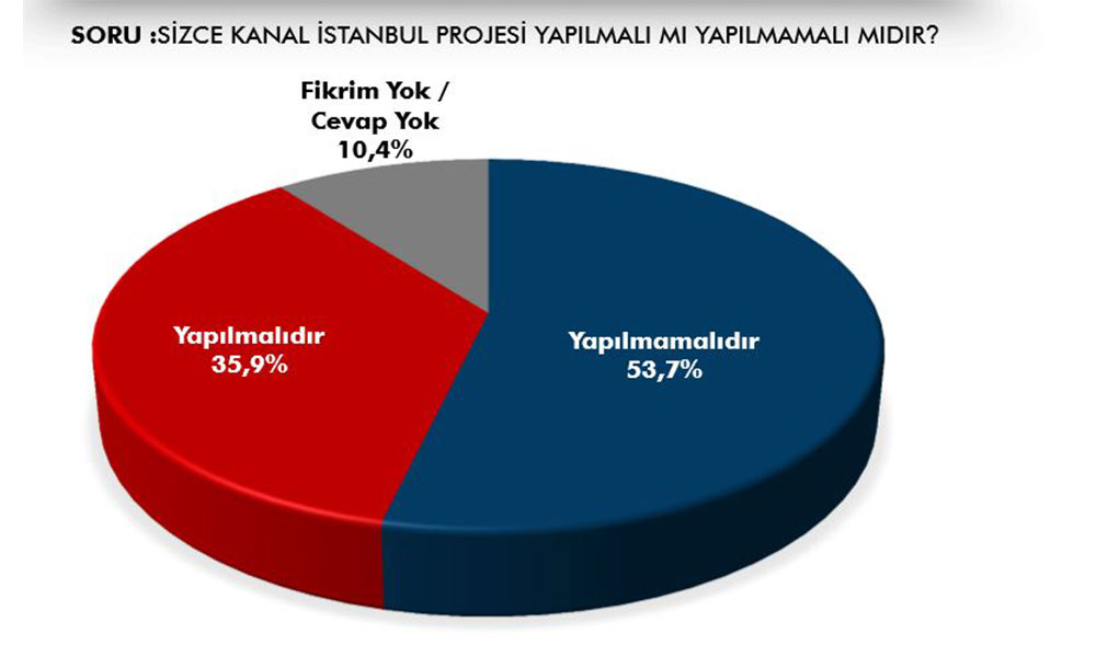 Sonar Araştırma Şirketi’nin, Kanal İstanbul projesiyle ile ilgili anketi 27 Ocak - 3 Şubat 2020 arasında İstanbul’un en kalabalık 30 ilçesinde 2 bin 69 kişiyle yüz yüze görüşülerek yapıldı. 25-34 ile 35-44 yaş aralıklarının en kalabalık grubu oluşturduğu ankette, "Kanal İstanbul projesi hakkında ne kadar bilgi sahibisiniz" sorusuna katılımcıların yüzde 39’u “Hiçbir bilgim yok”, yüzde 31.9’u “Biraz bilgim var”, yüzde 24.1’i “Yeterince bilgim var” yanıtını verdi. Sizce Kanal İstanbul projesi yapılmalı mı, yapılmamalı mı” sorusuna "Yapılmalıdır" diyenlerin oranı yüzde 35.9, "Fikrim yok" diyenlerin oranı yüzde 10.4 olurken projenin yapılmasını istemeyen ve soruya "Yapılmamalıdır" yanıtını veren yurttaşların oranı yüzde 53.7 oldu.