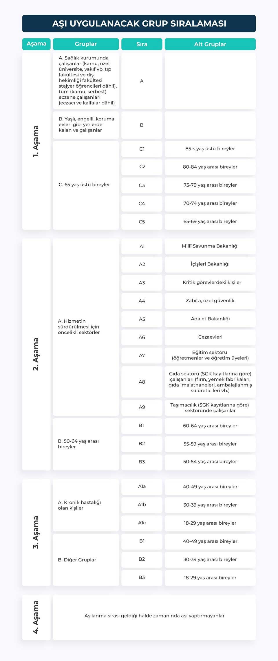 Türkiye'de milyonlarca insan umutla aşı sırasını bekliyor. Türkiye'de sağlık çalışanlarının aşılaması tamamlandı, 65 yaş üstü vatandaşların da büyük bir kısmı aşılandı. Sağlık Bakanı Koca, 60 yaş üzeri için 22 Mart haftasından itibaren aşı sürecinin başlayacağını bildirdi. Aşılama ile ilgili bilgiler telefon mesajları ile gelecek. https://tele1.com.tr/asi-takvimi-sonbahara-ertelendi-346405/ Peki sizin sıranız ne zaman? Bundan sonraki süreçte kim ne zaman aşılanacak? İşte Sağlık Bakanlığı'nın listesine göre aşılanma sıralaması: 1.AŞAMA 1A: Sağlık kurumunda çalışanlar (kamu, özel, üniversite, vakıf vb. tıp fakültesi ve diş hekimliği fakültesi stajyer öğrencileri dahil), tüm (kamu, serbest) eczane çalışanları (eczacı ve kalfalar dahil) 1B: Yaşlı, engelli, koruma evleri gibi yerlerde kalan ve çalışanlar 1C.65 yaş üstü bireyler 2.AŞAMA 2A: Hizmetin sürdürülmesi için öncelikli sektörler 2B: 50-64 yaş arası bireyler 3.AŞAMA 3A: Kronik hastalığı olan kişiler: halen immünsüpressif tedavi alanlar, metastatik ve/veya kemoterapi/radyoterapi alan kanser hastaları, kornea nakli hariç solid organ nakli, kemik iliği/kök hücre nakli yapılan hastalar, kronik obstrüktif veya destrüktif akciğer hastalığı veya status astmatikus hikayesi olan hastalar, insüline bağlı diyabet ve komplike (serebrovasküler, koroner, böbrek, polinöropati), insüline bağımlı olmayan diabetes mellitus hastaları, komplike hipertansiyon (serebrovasküler, böbrek, konjestif kalp yetmezliği), dekompanse kalp yetmezliği, akut koroner sendrom geçiren hastalar, kronik karaciğer ve böbrek yetmezliği olan hastalar, serebrovasküler hastalık (inme, kanama) geçiren hastalar. 3B: Diğer gruplar 4.AŞAMA Aşılanma sırası geldiği halde zamanında aşı yaptırmayanlar