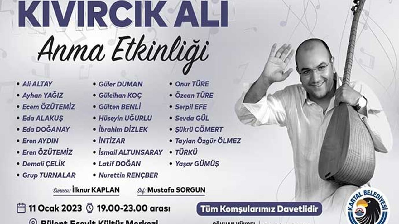 Kartal Belediyesi’nin düzenleyeceği Kıvırcık Ali’yi Anma Etkinliği, 11 Ocak Çarşamba günü yapılacak. Saat 19.00-23.00 saatleri arasında gerçekleştirilen anma programında sanatçı dostları; Ali Altay, Ayhan Yağız, Ecem Özütemiz, Eda Alakuş, Eda Doğanay, Eren Aydın, Eren Özütemiz, Demali Çelik, Grup Turnalar, Güler Duman, Gülcihan Koç, Gülten Benli, Hüseyin Uğurlu, İbrahim Dizlek, İntizar, İsmail Altunsaray, Latif Doğan, Nurettin Rençber, Onur Türe, Özcan Türe, Serpil Efe, Sevda Gül, Şükür Cömert, Taylan Özgür Ölmez, Türkü ve Yaşar Gümüş sahne alacak. Sunuculuğunu İlknur Kaplan’ın üstleneceği anma programında Şef Mustafa Sorgun eşliğinde Kıvırcık Ali’nin birbirinden güzel eserleri sanatçı dostları tarafından seslendirilecek.
