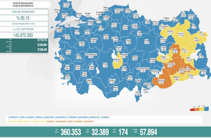 Sağlık Bakanlığı'nın paylaştığı haritada, 2. doz aşılamada hedef nüfusun yüzde 75 ve üzerinin aşılandığı iller mavi renkle gösteriliyor. Sağlık Bakanlığı'nın koronavirüs verilerine ilişkin yayınladığı tabloda yer alan bilgilere göre; 2. doz aşılamada yüzde 89.2 aşılama oranıyla Osmaniye birinci sırada yer alıyor. Yüzde 62.3 aşılama oranı ile Şanlıurfa ise son sırada bulunuyor. 2. doz aşılamada üç büyük ilde ise birinci sırada yüzde 85.1 ile İzmir, ikinci sırada yüzde 82.7 ile Ankara ve üçüncü sırada yüzde 77.5 ile İstanbul yer alıyor.