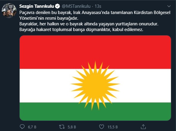 Tanrıkulu, paylaşımında “Paçavra denilen bu bayrak, Irak Anayasası’nda tanımlanan Kürdistan Bölgesel Yönetimi’nin resmi bayrağıdır. Bayraklar, her halkın ve o bayrak altında yaşayan yurttaşların onurudur. Bayrağa hakaret toplumsal barışa düşmanlıktır, kabul edilemez” ifadelerini kullandı.