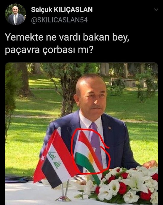 İyi Parti Sakarya İl Başkanı Selçuk Kılıçarslan, Twitter hesabından Dışişleri Bakanı Mevlüt Çavuşoğlu’nun 4 Eylül’de Irak Kürdistan Bölgesi Başkanı Neçirvan Barzani ile gerçekleştirdiği görüşmedeki masaya konulan Kürdistan Bayrağı’nı işaretleyerek, “Yemekte ne vardı bakan bey, paçavra çorbası mı?” şeklinde paylaşım yaptı.