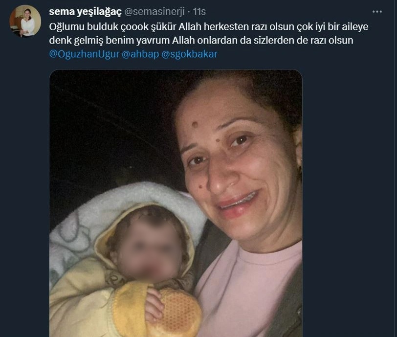 Hatay Atatürk Caddesi Ovalı Apartmanı'nın enkazından çıkarılan 1 yaşındaki Süleyman Ali Alpaslan, 2 gün süren aramanın ardından annesine kavuştu. Minik Süleyman'ı binadan çıkaran kurtarma ekibi, komşusu olduğu söyleyen bir aileye teslim ettiğini söyledi. Ancak aile böyle bir komşuları olmadığını söylemişti. Anne Sema Alpaslan minik Süleyman'ı sosyal medyada aramaya başlamıştı. Süleyman'a ulaşılması için Müge Anlı da seferber olmuştu. https://tele1.com.tr/turkiye-kahramanmaras-merkezli-7-7-ve-7-6lik-depremlerle-sarsildi-binlerce-olu-binlerce-yarali-783879/ Dün akşam saatlerinde anne Alpaslan, Süleyman'ın bulunduğu haberini verdi. İşte annenin o paylaşımı: