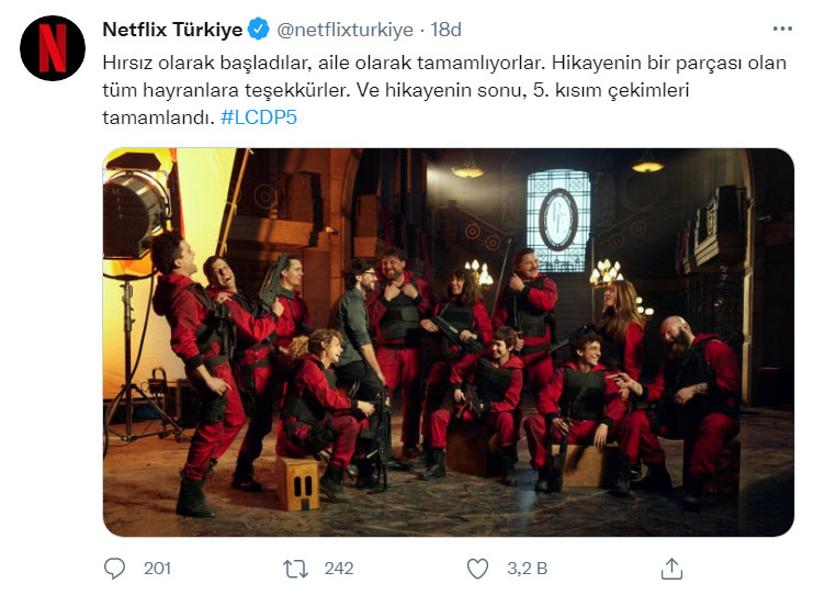 Geniş hayran kitlesine ulaşan La Casa de Papel dizisinin yeni sezonunun ne zaman yayınlanacağı merak edilirken, Netflix Türkiye'den izleyicileri heyecanlandıran bir paylaşım geldi. Paylaşımda, "Hırsız olarak başladılar, aile olarak tamamlıyorlar. Hikayenin bir parçası olan tüm hayranlara teşekkürler. Ve hikayenin sonu, 5. kısım çekimleri tamamlandı" denildi.