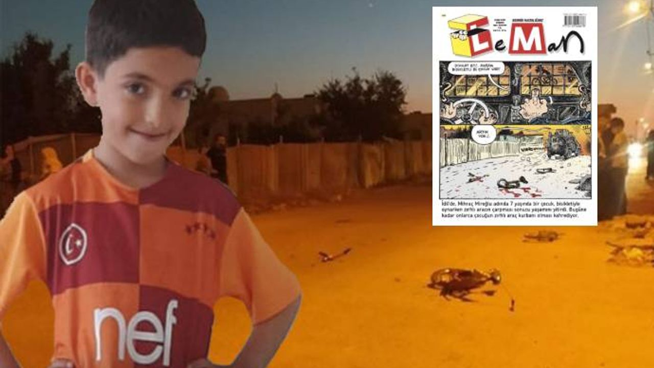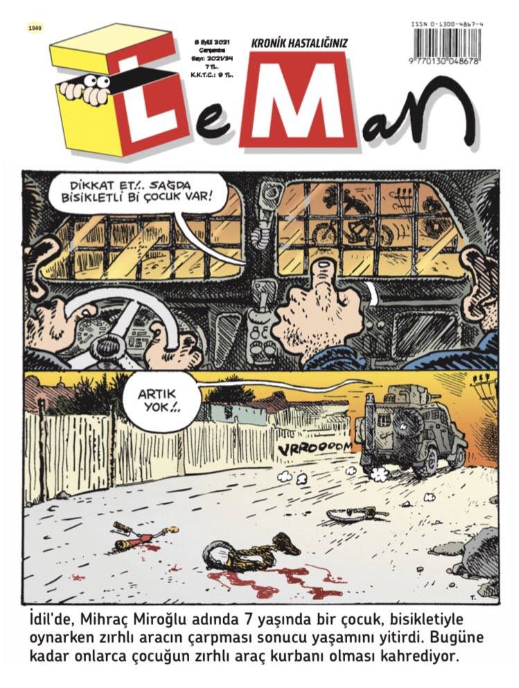 Haftalık karikatür dergisi Leman, 3 Ağustos’ta Şırnak’ın İdil ilçesinde zırhlı polis aracının çarpması sonucu yaşamını yitiren Miraç Miroğlu'nu kapağına taşıdı.