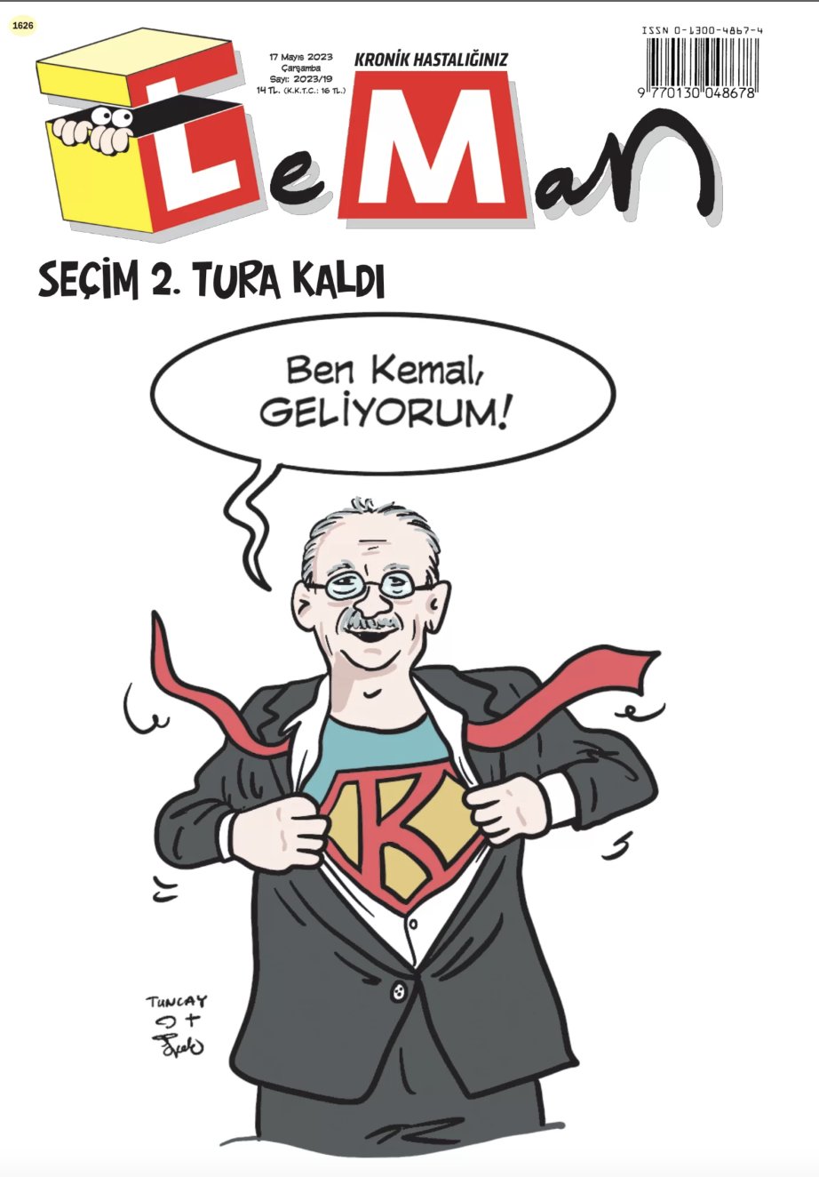 Leman, bu haftaki sayısındaki kapağına 'Seçim 2. tura kaldı' notunu düşerek Millet İttifakı'nın Cumhurbaşkanı adayı Kemal Kılıçdaroğlu'nu taşıdı. Derginin Kılıçdaroğlu'nu Süperman karakteri ile özdeştirdiği kapağı şöyle: