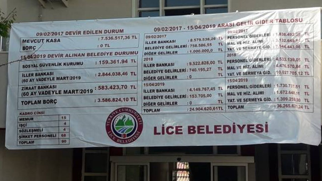 HDP'nin 31 Mart yerel seçimlerinde yeniden aldığı Lice Belediyesi, kayyumun icraatlarını pankartla binasına astı. Kayyum, 7 milyon 536 bin TL ve sıfır borçla aldığı belediyeyi 3 milyon 586 bin TL borçla devretti.